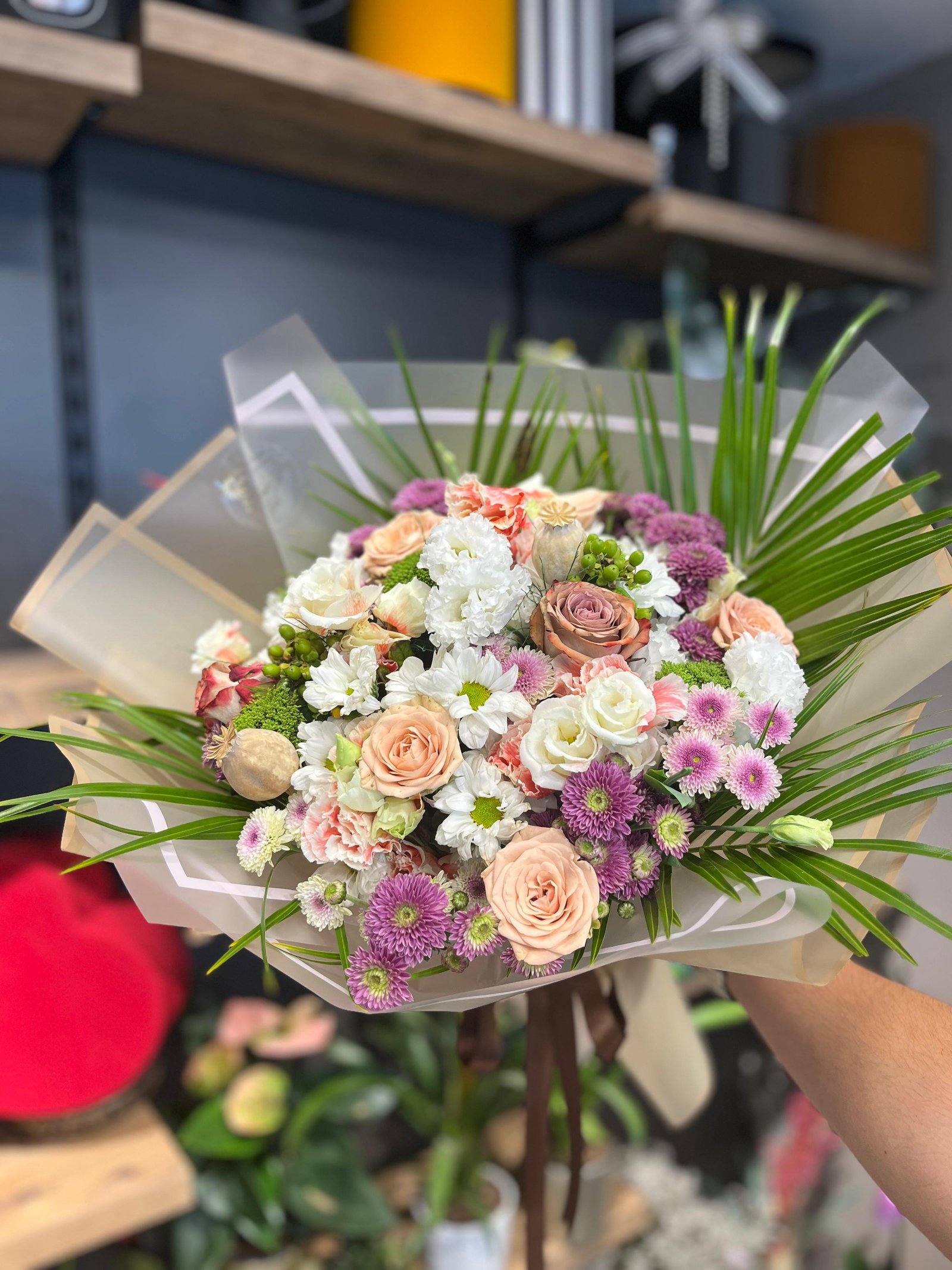 Papatya, gül, krizantem ve yeşilliklerin dengesi hem neşeli hem sıcak bir mesaj verir. Mevsimsel değişimlere göre tonlar güncellenir; buket her zaman canlı ve dengeli tutulur.