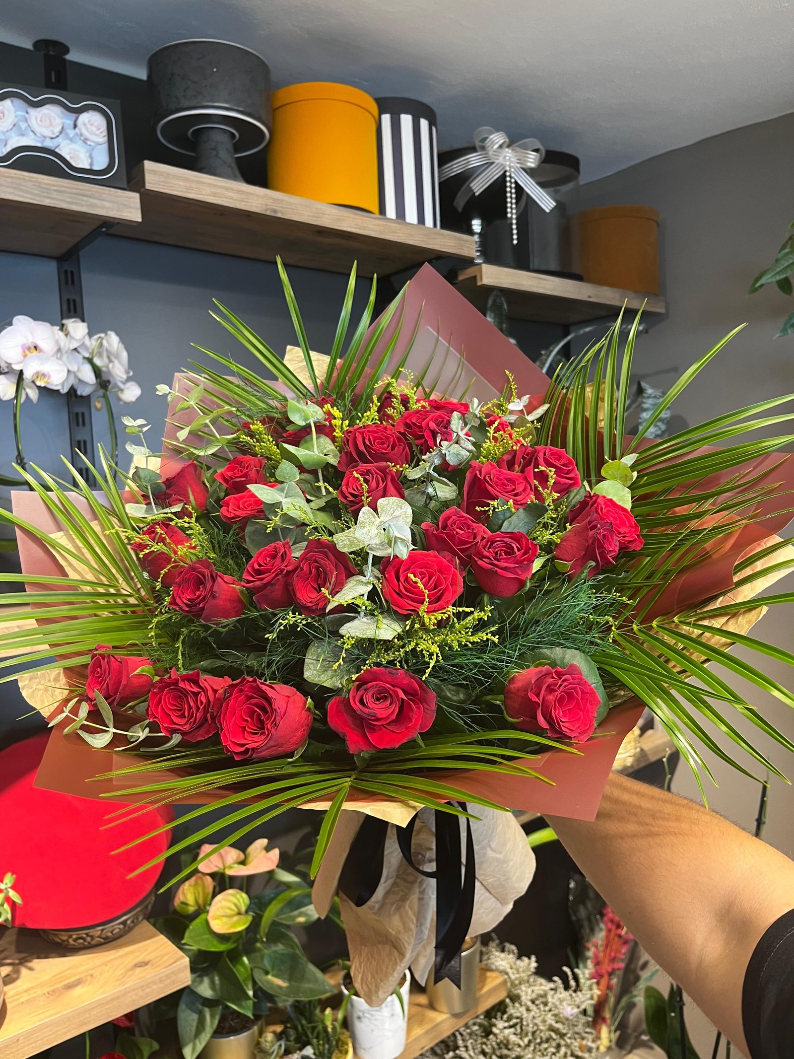 Bu tasarımda tazelik, renk uyumu ve zarif düzen ön plandadır; KIRMIZININ AŞKI Yiğit Çiçekçilik’in el emeğiyle Bursa’da hazırlanır.