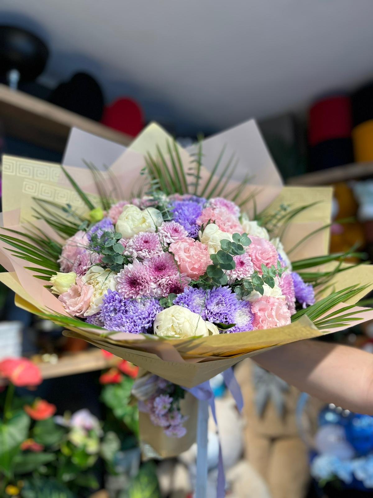 Papatya, gül, krizantem ve yeşilliklerin dengesi hem neşeli hem sıcak bir mesaj verir. Mevsimsel değişimlere göre tonlar güncellenir; buket her zaman canlı ve dengeli tutulur.